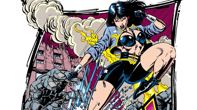Princess Diana didn't stop being a hero, of course. She just fought the good fight in biker shorts, a strappy bikini top, a bolero jacket, and no less than three belts. It was, in short, the most '90s of looks. She even got a shorter haircut with bangs to complete the aesthetic. Naturally, she got her title and the costume that goes with it back after a few months, and her hair even grew back out as soon as she put it on.