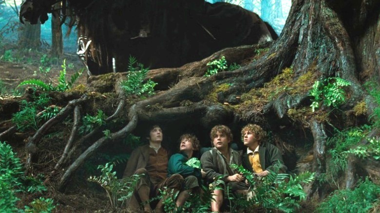After the four hobbits tumble down a hill, they gather themselves to their feet just as Frodo senses a dangerous presence coming down the road. Frodo frantically commands the others to hide, and they find the perfect spot under the roots of a large tree.