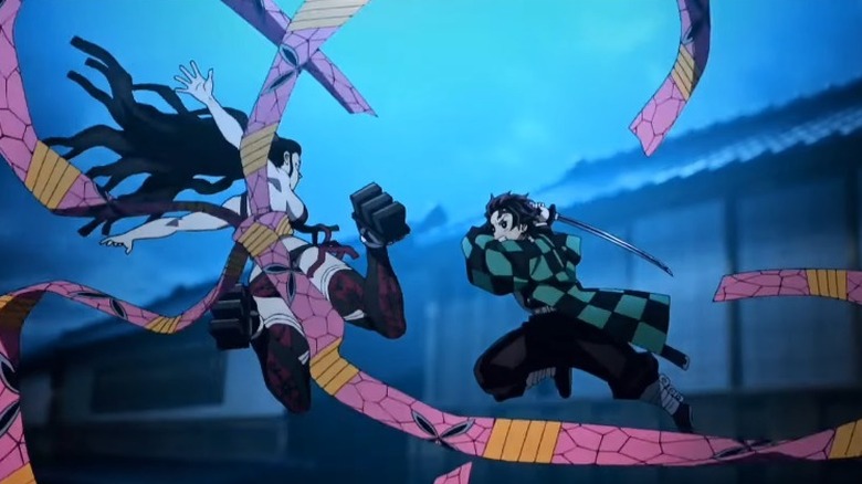 During her battle with Tanjiro in manga chapter 81 (via Viz), we see that Daki can surround herself in a flurry of sashes, and she attacks from a distance. But the end of the manga chapter reveals one of the ability's biggest surprises. As Tanjiro manages to get close enough to cut her head off, Daki transforms her neck into a sash, and it takes on a fabric-like quality that makes it near impossible for the demon slayer to cut. So not only can she transform any part of her body into the sash, but they can also take on properties soft enough to make it hard to cut. In addition to attacking and defending, as we see for poor Zenitsu in the latest arc's Episode 3 (via Crunchyroll), they can also capture people. And in the following episode with the Oiran, the sashes can also absorb people.