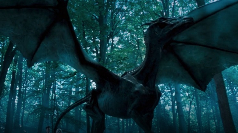 The end of Harry Potter's (Daniel Radcliffe) fourth year of school marks a sharp turn in the series' tone: fellow student Cedric Diggory (Robert Pattinson) is dead, Lord Voldemort (Ralph Fiennes) has risen, and the Wizarding World feels darker and more dangerous than the unabashed wonder of Harry's first foray into magic. Up to this point, we've seen an array of magical creatures, from fire-breathing dragons to giant, three-headed dogs, but it's not until things get truly serious that we meet the thestrals.