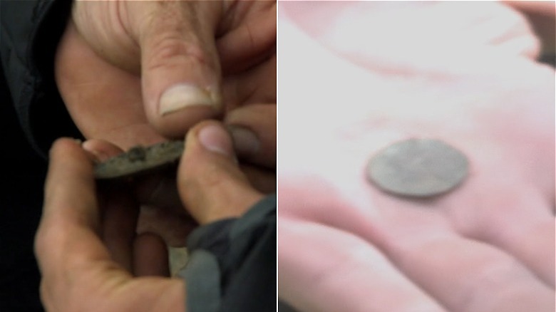 After initially digging up a musket ball used in 17th century guns, they soon find what appears to be a maravedi, similar to what was found in the Season 1 finale "The Find." The difference here is that this coin has been cut into a smaller segment.