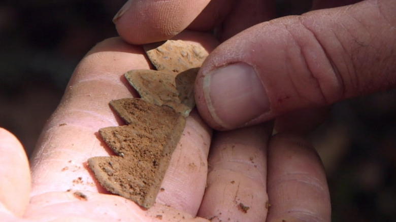 Amirault and Taylor uncover pottery pieces hand painted in bright red, blue, and green colors. These exquisite pieces are further examples of buried man-made objects spread throughout the underground of Oak Island. These pottery pieces and even more artifacts have been specifically found along the stone pathway the team is attempting to explore.