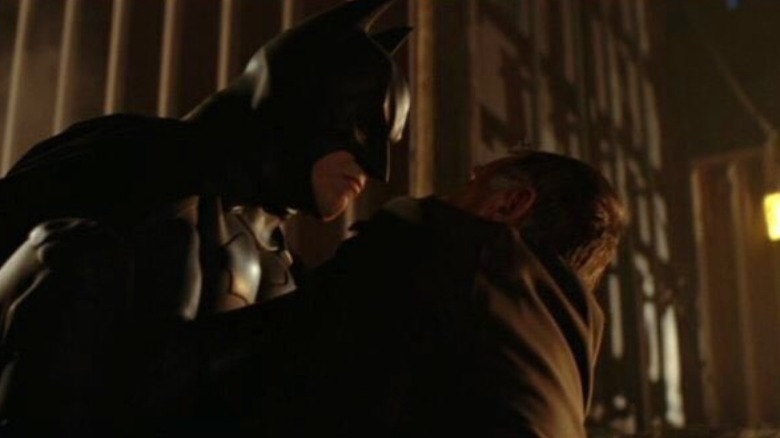 As he heads down a dark alley with his food, however, Flass gets a surprise. He's instantly flipped upside down by a wire and hoisted up several stories to dangle near a rooftop where Batman waits. Batman furiously grabs Flass by the hair and demands that he tell him where the rest of the drug shipment from the dock is headed, prompting this classic exchange: "I don't know," gasps Flass. "I swear to God..." "Swear to me!" Batman roars in response. He even induces a bit more fear into the visibly shaken Flass by pretending to drop him and then reeling him back up. Bale's performance alone is certainly ferocious enough to watch again and again.