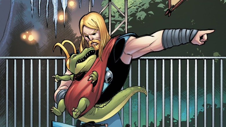 The series is written by comic writer Alyssa Wong, with the accompanying artwork done by Robert Quinn. "Alligator Loki #1" has already debuted in the Infinity Comics format of the Marvel Unlimited platform. It brings readers into the comic as Thor chases Loki to The Rainbow Bridge, a.k.a The Bifrost. In his efforts to recover Loki after The Trickster God jumps into a portal, Thor accidentally brings back Alligator Loki — only to become fast friends with the scaly version of his brother. What follows is an entirely silent comic that sees The God of Thunder take his new companion to an amusement park as they become better acquainted with one another.