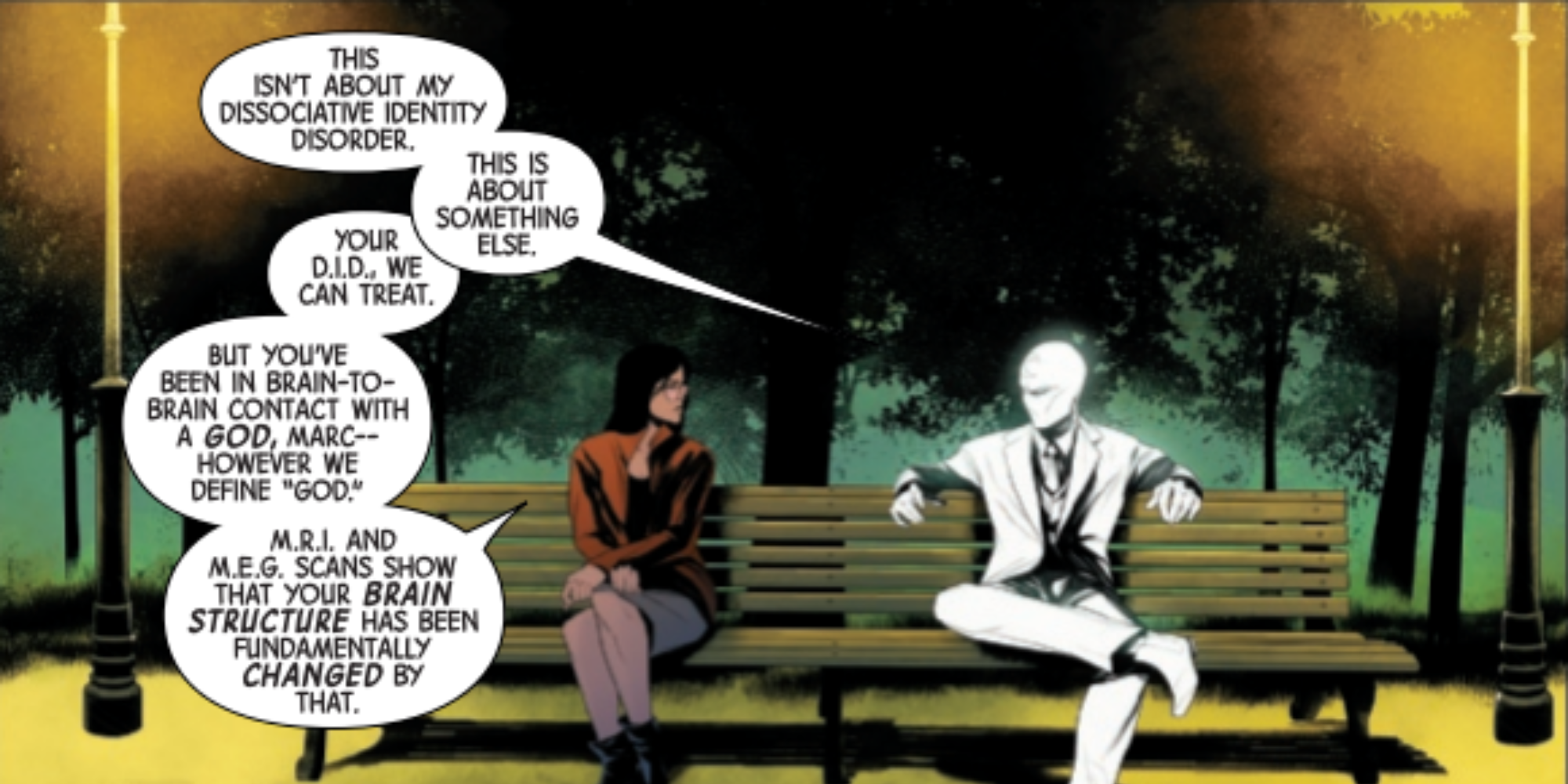 The series then continued retconning its character by gradually revealing Spector's mental illness and, four years later, finally mentioning his Jewish heritage and rabbi father. Then over the years, his mental illness — finally labeled as dissociative identity disorder — became a side effect of his death and merger with Khonshu, was removed entirely (in Warren Ellis' bombshell 2014 run), ceased to be an illness at all but rather a traumatic childhood brain injury as a result of Nazi abuse, and then (in the same issue, mind you) possibly just a condition inherited from his father.