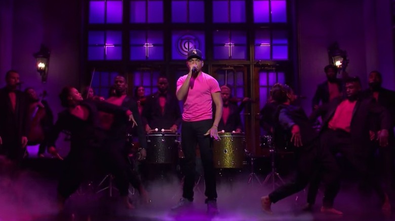 This was the case in a recent discussion about a Saturday Night Live milestone dubiously attributed to another host. Chance is no stranger to SNL. He's performed as the musical guest three times (not counting his cameo with Justin Bieber) and hosted twice (via IMDb). He's also part of a distinguished list of artists who have pulled double duty of hosting and performing as the musical guest — one that includes Dolly Parton, Lady Gaga, Ariana Grande, Stevie Wonder, and many others (via Insider). But Chance has the unique honor of doing one thing on Saturday Night Live that no other guest had ever done before.