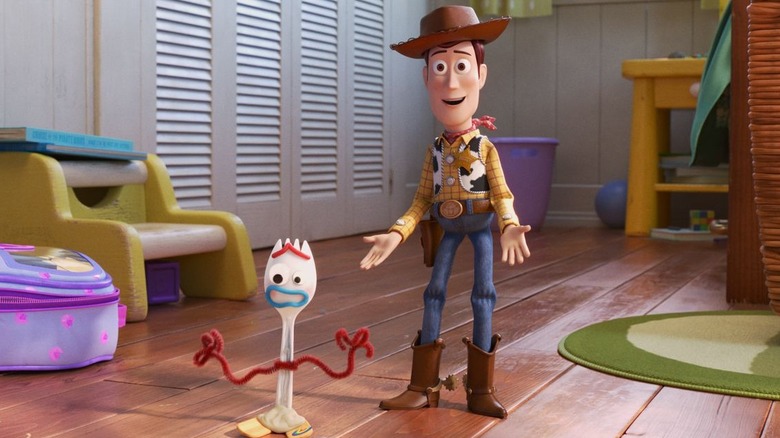 The first new toy introduced in "Toy Story 4" is Forky, a makeshift toy constructed by Bonnie as part of an arts and crafts project when she begins kindergarten. Bonnie plays with Forky at school and the toy suddenly gains sentience on the ride back home, to his sheer horror — he's left grappling with his newfound existence. Forky's existential nightmare raises some serious questions about what exactly qualifies as a toy in the "Toy Story" universe. How much playtime is needed for something to become sentient?