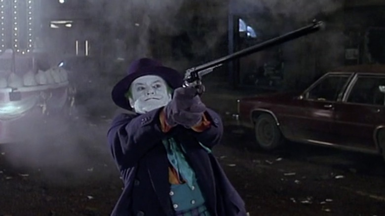 After The Joker's plan has been disrupted by Batman flying through in his trusty batwing, the villain resorts to some unconventional firepower. The Joker reaches into his waistband and removes a pistol with a comically long barrel that had to have been constricting while he was dancing to Prince tunes. Batman revs up his batwing and swoops down between the skyscrapers in preparation for a flyby. As he closes in, The Joker fires off one shot that sends the batwing into a death spiral.
