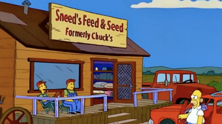 The 1999 episode "E-I-E-I (Annoyed Grunt)" finds the Simpsons fleeing to Grandpa Simpson's old farmhouse in the country so as to avoid a duel with a Southern gentleman. Homer decides to live off the land and grow his own crops, but to so do he needs some supplies, which he gets at a shop called Sneed's Feed & Seed. The store's signage tells us that the place used to be named Chuck's. If that business used the same rhyming name scheme as Sneed's Feed & Seed, it means Chuck's was selling an, ahem, completely different product line.