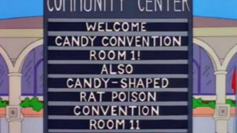The Simpsons often makes fun of businesses and public places with hilarious reader boards that appear onscreen for just a second or two. Two standouts: "It Blows: The Air Conditioner Store," and "Springfield Sperm Bank: Put Your Sperm in Our Hands." This sign is probably the most elaborate and subtle of them all (not to mention dark.) Homer drags the clan to the Springfield Community Center for a candy convention, and they're lucky they make it out alive—the sign out front reads "Welcome Candy Convention Room 1! Also Candy-Shaped Rat Poison Convention Room 11."