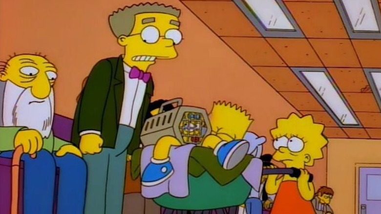 Sometimes a Simpsons joke is subtle because it has to be. Network TV shows can't make explicit jokes today, and they really couldn't in 1997, when "My Sister, My Sitter" first aired. While Lisa is babysitting Bart and Maggie, Bart hits his head and knocks himself out. Lisa pops him into a wheelbarrow and takes him to the sleazy but discreet Dr. Nick's Walk-In Clinic. Lisa sees Smithers and asks if she can cut in line because Bart "may be seriously hurt." "Um, no," Smithers replies. "I really would rather get this taken care of." Get what taken care of, exactly? He doesn't say, but that remark, along with the fact that Smithers is standing in front of his chair while everybody else is sitting, suggests that Smithers can't sit down because he's got something...lodged...back there.