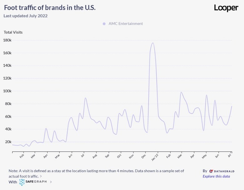 According to Statista, the largest movie theater chain in the United States and Canada Is AMC, which has around 7,850 screens. However, Data Herald's original research reveals that the prolific theater chain has suffered an incredible decline in foot traffic over the last year. The above graph indicates that there was only a spike in traffic at AMC theaters between December 2021 and January 2022. In February 2021, AMC received less than 20,000 visitors per month, but between December and January, it rose to nearly 180,000 before promptly dipping again. The chain has not broken the 100,000 visitors per month mark for the rest of the year, or at least till July 2022, which is where our raw data stops.