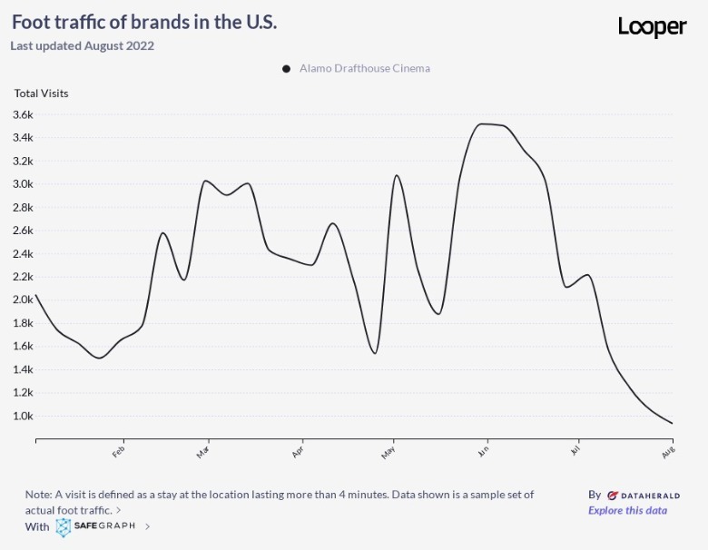 The Alamo Drafthouse chain of cinemas has had quite the year in terms of visitors. Based on information gathered by Data Herald, the theater seems to pull in guests immediately after a big film drops and then sees a significant decline in foot traffic shortly after. The Alamo Drafthouse, which boasts 36 locations, had a decent first half of January with a little under 2,100 visits. Those numbers started to drop toward the end of the month, likely due to the interest in "Spider-Man: No Way Home" dying down, which premiered on December 17, 2021.