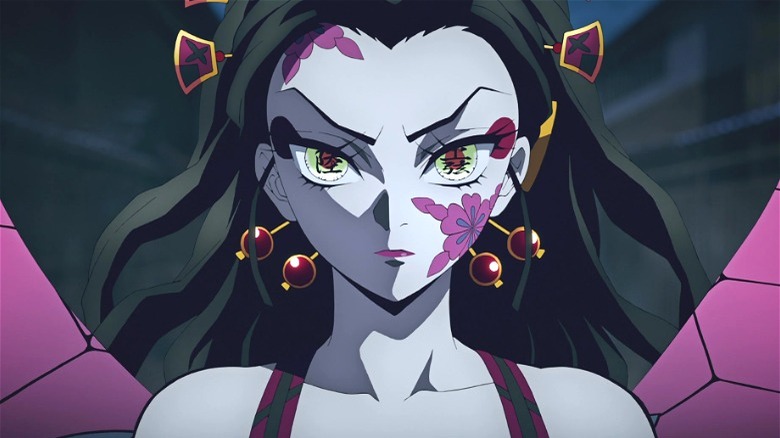The second half of Season 2 begins with the flamboyant return of Sound Hashira Tengen Uzui, a former ninja with an attractive face and muscular physique. To take Aoi's place in the mission, Tanjiro, Zenitsu, and Inosuke boldly volunteer to accompany Tengen to the flashy Entertainment District, where a powerful demon is wreaking havoc and instilling fear among the brothels by abducting a number of courtesans. During this arc, the viewers will be introduced to the beautiful and cruel Daki, the demon in question who is hiding in plain sight as a famous oiran. She is an Upper Rank Six demon, one of Muzan's loyal Twelve Demon Moons.