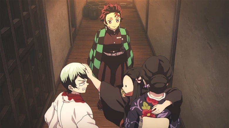 Despite initially depicting warm scenes that will make you root for Tanjiro, viewers will soon learn how dark, gruesome, and horrific the series can be with the revelation of the demons. Tanjiro's tragic origin begins when his blissful and simple life suddenly turns into a nightmare after he discovers that a demon has killed his family. He finds a glimmer of hope in the survival of his sister Nezuko, but she soon turns into a demon. Soon, a mysterious swordsman arrives and tries to kill Nezuko. However, Tanjiro's determination to protect his sister convinces the man to let Nezuko go.